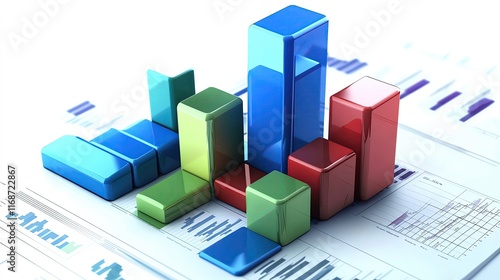 A photostock of multicolored 3D bar charts and graphs on paper, representing financial data and business performance