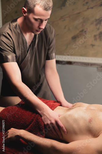 A physiotherapist massager man activates a diaphragm massage to a muscular client male athlete. Close-up. Small depth of field