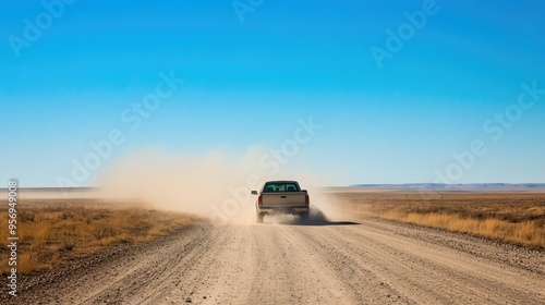 A pickup truck driving down a dirt road with dust clouds trailing behind, under a clear blue sky.