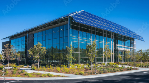 A picture shows an office building with solar panels on the roof. Money is falling from the sky, suggesting the building is saving money with solar energy.