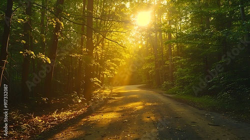 A picturesque drive through a sun-dappled forest, the light streaming through the leaves creating a warm and inviting glow, the vibrant greenery adding to the serene and peaceful atmosphere,