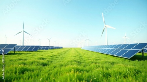 A picturesque expanse of verdant grassland dotted with rows of solar panels and wind turbines, symbolizing a sustainable energy future