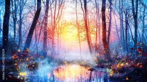 A picturesque fairy-tale grove featuring a small, sparkling pond reflecting the soft hues of a sunset sky, delicate wisps of mist dancing across the water’s surface, with fireflies flickering