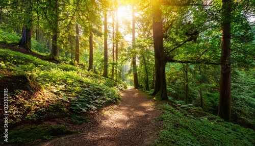 a picturesque pathway illuminated by warm sunlight weaving through a vibrant green forest evokes feelings of adventure peace and connection to nature s beauty