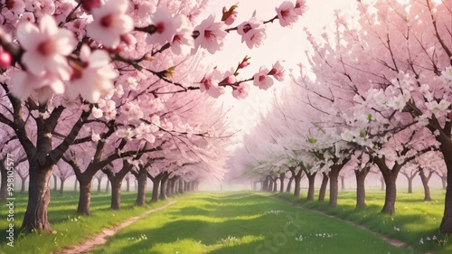 A picturesque pathway lined with blooming cherry trees, creating a captivating, romantic atmosphere.
