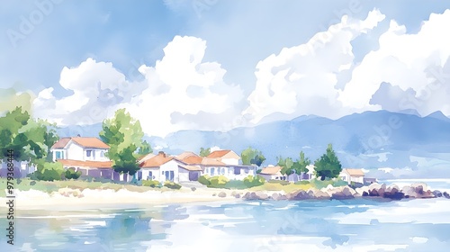 A picturesque village on a rugged coastline, houses in vibrant hues, dramatic clouds rolling in, captured in a blend of watercolor and oil techniques