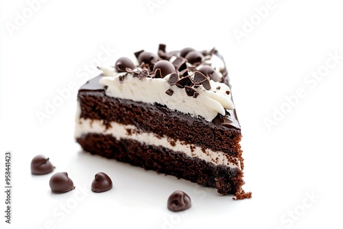 A piece of chocolate cake with cream on a white background. Generative Ai