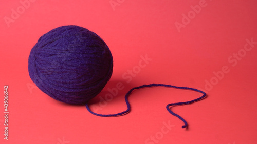 A Piece of knitting with color threads ball of yarn and a knitting needle on red background.