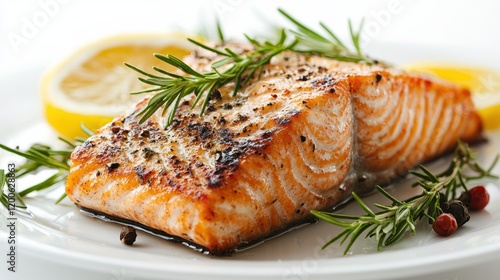 A piece of salmon with lemon slices and rosemary on top. Generative AI