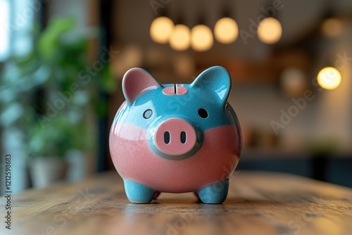 A piggy bank with a pink and blue design sits on a wooden table, ready for saving money