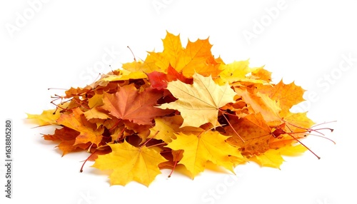 A pile of autumn maple leaves in yellow, orange, and red hues, isolated on a white background