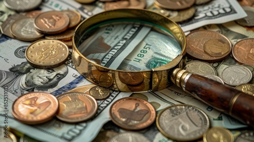 A pile of cash and coins with a magnifying glass highlighting a small increase in value, depicting inflation scrutiny --ar 16:9 Job ID: 656c80bc-8bcd-486b-b774-4a5e2556af08