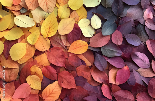 A pile of colorful autumn leaves spread out on the ground, seen from above