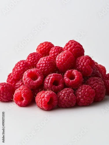 A pile of fresh, red raspberries arranged on a white background, showcasing their vibrant color and juicy texture. This image symbolizes health, summer, sweetness, nature, and abundance.