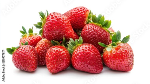 A pile of freshly picked strawberries, their bright red hue and juicy texture inviting, Set against an isolated white background to accentuate their natural sweetness