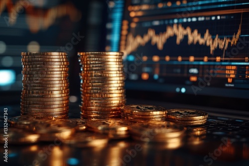 A pile of gold coins is arranged on a computer screen with a graph displayed