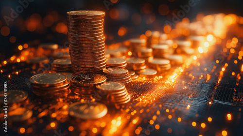 A pile of gold coins is on a table with a glowing background. The coins are arranged in a pyramid shape, with the largest coin at the top and the smallest at the bottom