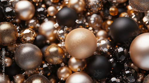 A pile of metallic glass ornaments, with glitter on them in large and small sizes, Christmas tree toys arranged to create a festive atmosphere for Christmas