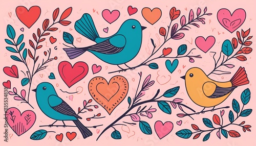 a pink background. It features a variety of colorful birds and hearts in different sizes and colors