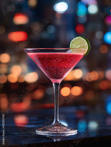 A pink cosmopolitan cocktail in a martini glass with a lime twist garnish. The drink is set on a chic, modern bar counter with a blurred cityscape in the background.