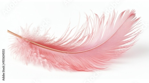 A pink flamingo feather resting gently on a white background, symbolizing elegance and beauty -