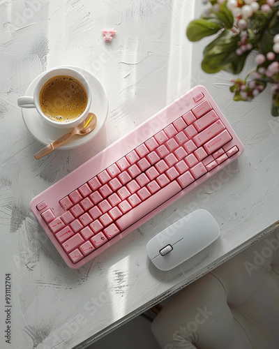 A pink keyboard, a mouse, on a white table, with a cup of coffee beside it. top view. Generative AI.