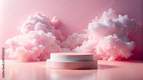 A pink podium set against a background of soft, pastel clouds and a clear, blue sky. The minimalist design and gentle colors create a tranquil and dreamy atmosphere, perfect for highlighting beauty