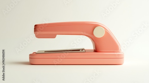 A pink stapler positioned sideways on a neutral background, showcasing its design and function.