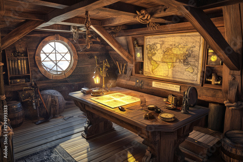 A pirate captain’s quarters 3D background room aboard an old wooden ship, filled with nautical maps, antique compasses, and a massive wooden desk covered in treasure charts. A lantern casts a warm