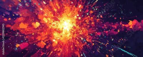 A pixel art representation of a chaotic explosion of pixelated abstract elements, bursting with pixelated energy and emotion.