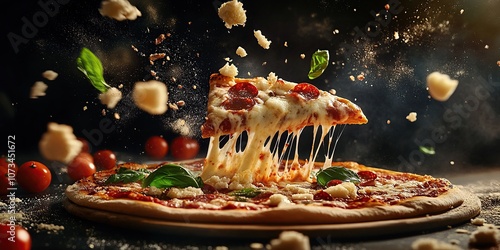 A pizza is being bent in the air, with its cheese and ingredients flying around it