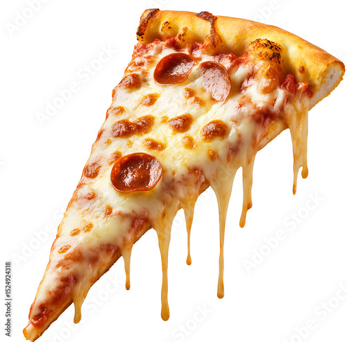 A pizza slice with dripping cheese, transparent background, PNG file.