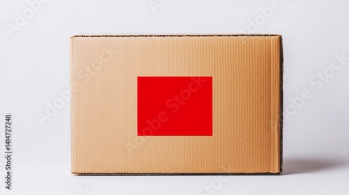 A plain cardboard box with a red square label on its front, set against a simple white background.
