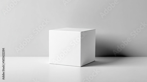 A plain white cube on a smooth surface against a light gray background. The cube is perfectly symmetrical and has no markings or textures.
