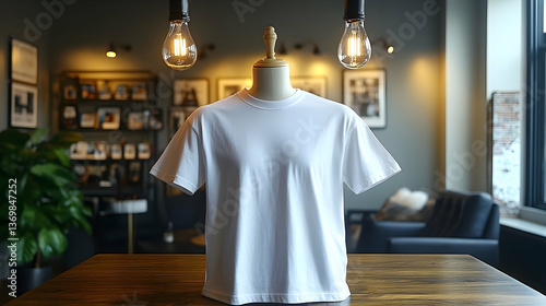 A plain white t-shirt displayed on a wooden table under hanging lights in a stylish interior setting