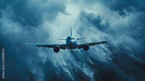 A plane is flying through a stormy sky. The clouds are dark and heavy, and the rain is pouring down. Scene is tense and dramatic, as the plane navigates through the dangerous weather conditions