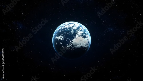 A planet in space with a lot of stars. The planet is blue and white. The stars are scattered all over the sky