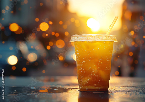 A plastic cup of iced coffee with a bokeh background in sunlight