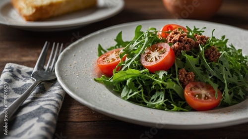 A Plate of Arugula Salad with Tomatoes with Minced Meat