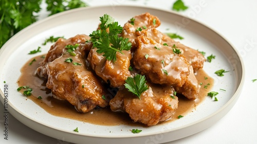 A plate of crispy chicken drenched in gravy, isolated on a bright white surface with a decorative swirl of gravy and fresh parsley