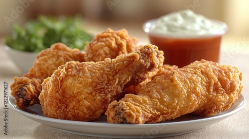 A plate of crispy fried chicken drumsticks with dipping sauce and fresh greens.