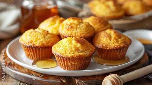 A plate of fluffy corn muffins, fresh out of the oven, with a jar of honey and a butter knife beside them