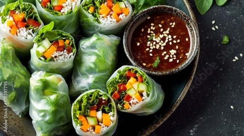 A plate of fresh spring rolls filled with vegetables and served with a side of dipping sauce.