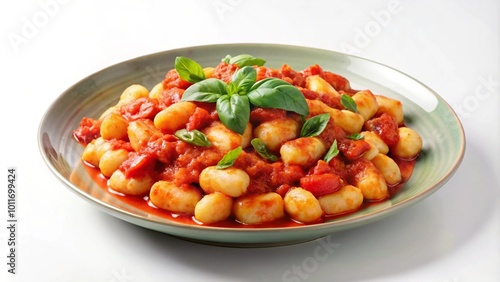 A plate of gnocchi with tomato sauce and basil.