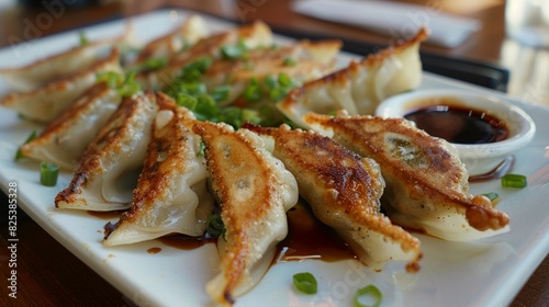 A plate of Japanese gyoza dumplings with crispy edges, served with a soy dipping sauce and garnished with green onions