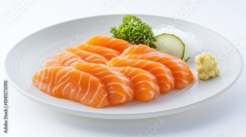 A plate of raw sashimi-grade salmon slices with soy sauce, wasabi, and garnish.