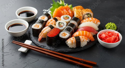 A platter of assorted sushi rolls and nigiri with soy sauce and chopsticks on a dark background