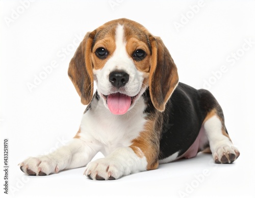 A playful beagle puppy lies on a white surface, showcasing its adorable face and bright, expressive eyes.