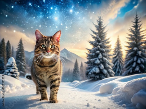A playful cat bounds through a snowy wonderland, chasing delicate snowflakes as they dance around, creating a joyful