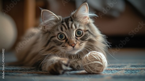 A playful cat lying on a rug with a ball of yarn, showcasing curiosity and charm.
